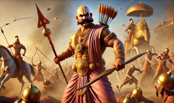 Duryodhana, along with Dhushasana, led his Kaurava forces into battle. Bhima did the same from the Pandava side. The battlefield of Kurukshetra became a landscape of intense and frenzied combat with countless warriors fighting and falling.