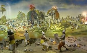 Chariots overturned, elephants trumpeted in pain and the ground turned slick with blood, making it treacherous. The uproar was earth-shattering, with drums, conchs, pipes mixed with war cries as well as the cries of wounded and dying warriors.