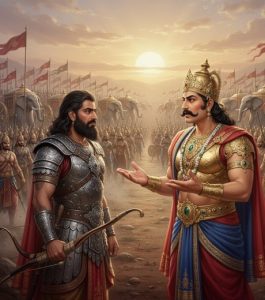 Krishna halted Arjuna’s chariot and firmly reminded him that after all those years of exile, this was the moment to fulfill his duty as a warrior — that his brothers and soldiers depended on him and that he must fight with full strength.