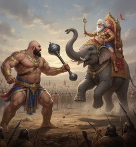 The king of Vanga joined him, bringing armored elephants that offered crucial support and added excitement to the scene. Ghatotkacha threw a massive javelin at Duryodhana, but the Vanga king intervened, sacrificing one of his elephants to protect the Kaurava prince. The elephant’s fall shook the earth and momentarily brought the battle to a halt.