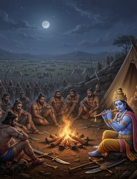As sunset marked the end of the seventh day of battle, the warriors returned to camp. That night, Krishna’s flute calmed the wounded and grieving, illustrating that even during hardship, compassion and reflection remain possible.