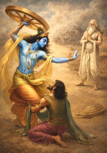 Observing Arjuna’s continued indecision, Krishna’s patience reached its limit. Declaring that the situation was out of hand, he jumped down from the chariot, took up his Sudarshana Chakra (the divine discus) once more, and advanced toward Bhishma with resolute determination.