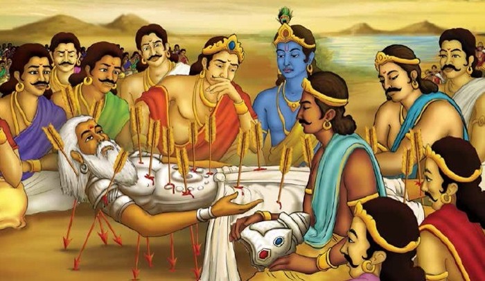 After Bhishma was defeated, a temporary truce was declared. Soldiers from both sides gathered around him. Arjuna and Krishna rushed there.