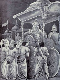 As his body descended, the devas (Gods) paid their respects from the heavens. A gentle mist, carrying a delightful scent, drifted through the air. The warriors on both sides stopped fighting and gathered to honor the fallen hero.