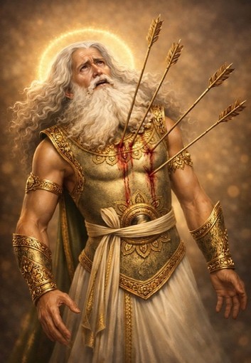 Determined to resist, he hurled a javelin at Arjuna, who shattered it midair with three arrows. Recognizing his defeat, the grandsire prepared to dismount, but Arjuna’s arrows destroyed his shield and struck him repeatedly. He fell from his chariot, his body supported above the ground by the arrows embedded in him by Arjuna.