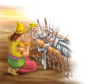 Bhishma’s whole body was pierced by arrows. He looked at Dushasana and said, “These arrows are Arjuna’s. They are not Shikhandi’s arrows.” Bhishma remained calm as he faced his fate. He was certain that this tenth day of the war would be his final day in combat.